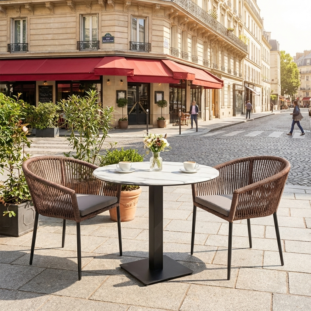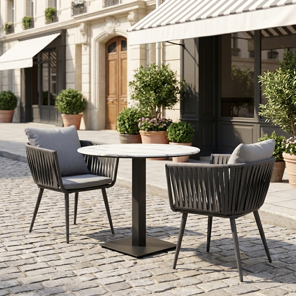 Table Outdoor ronde Catania en 80cm aspect marbre blanc Compact HPL Plateau de table