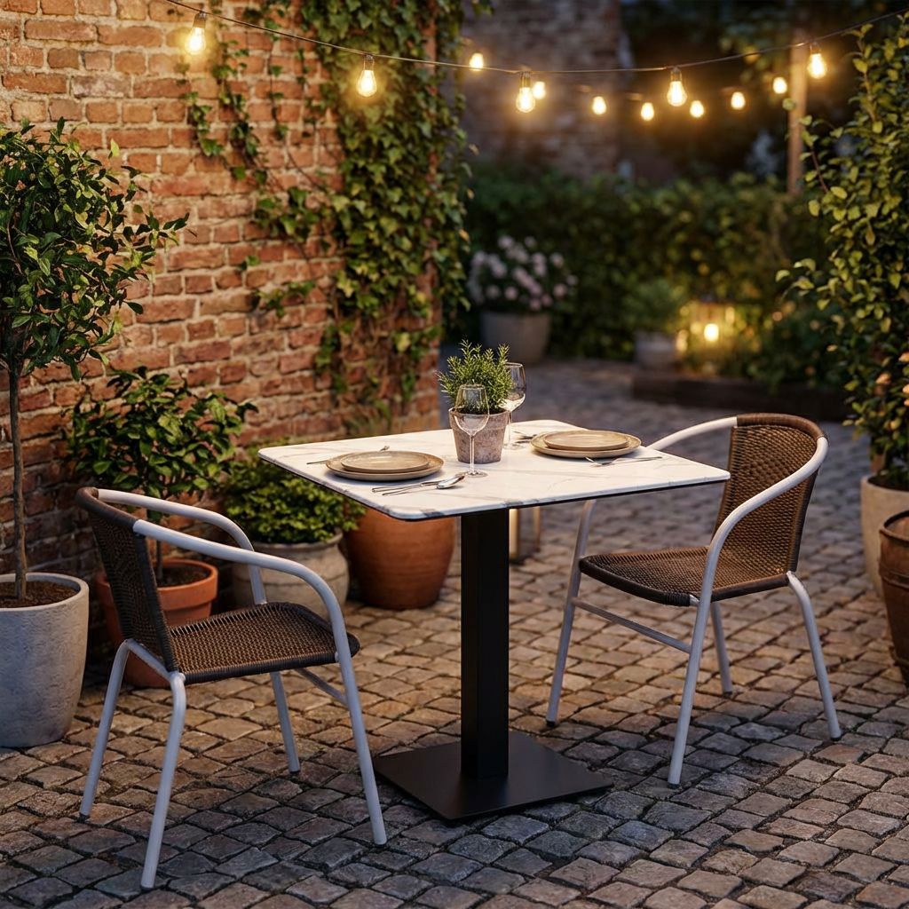 Table d'extérieur Catania en 70x70cm aspect marbre blanc Compact HPL Plateau de table