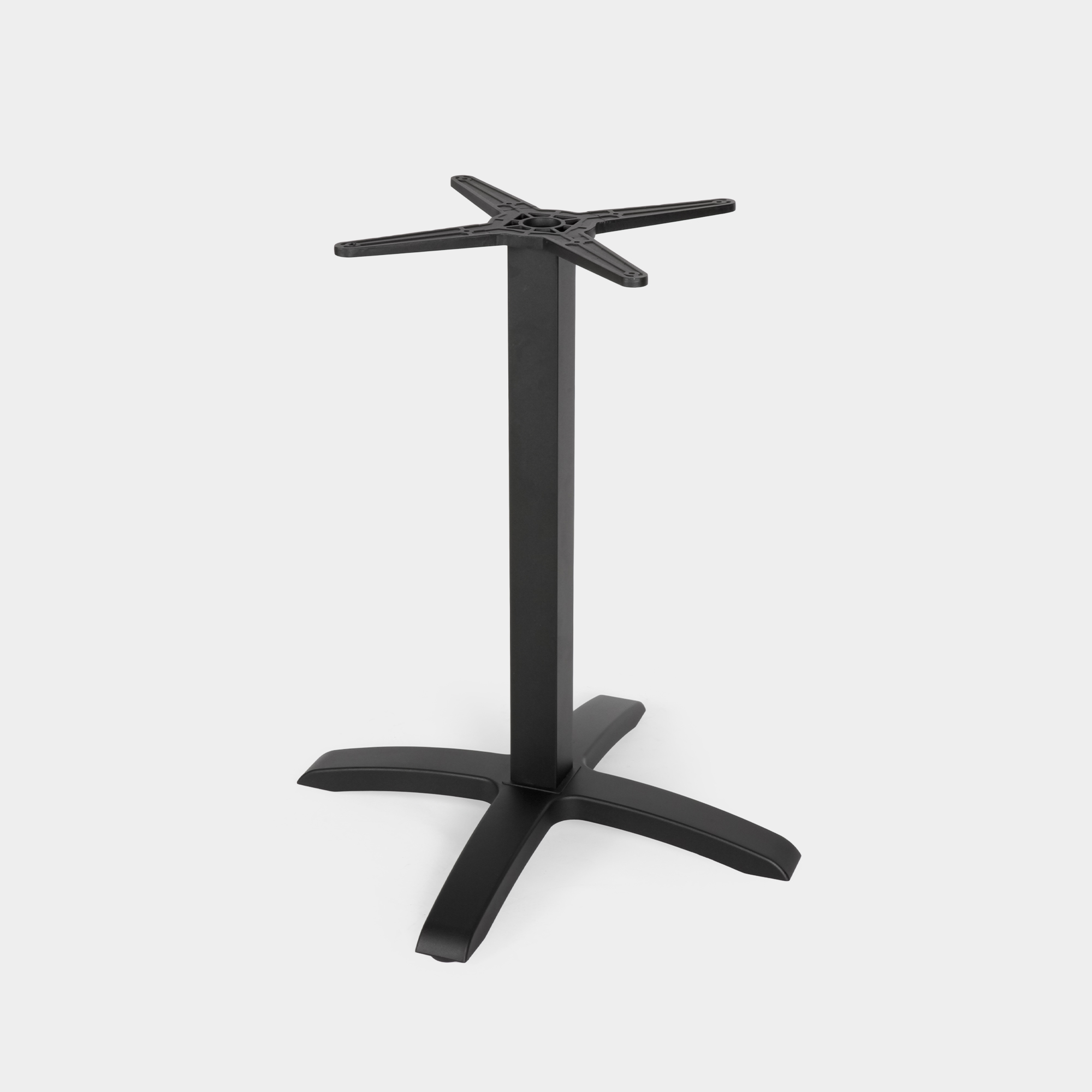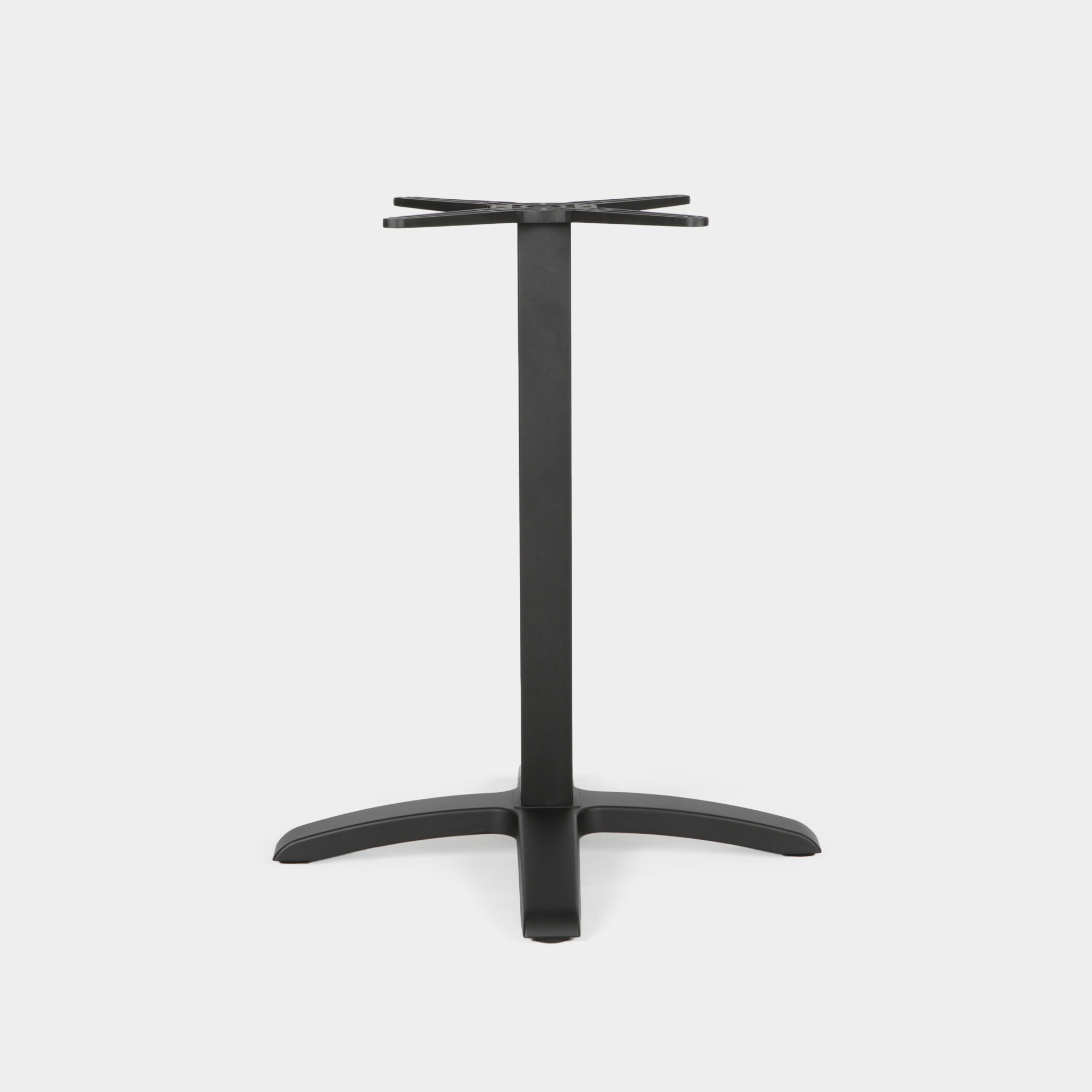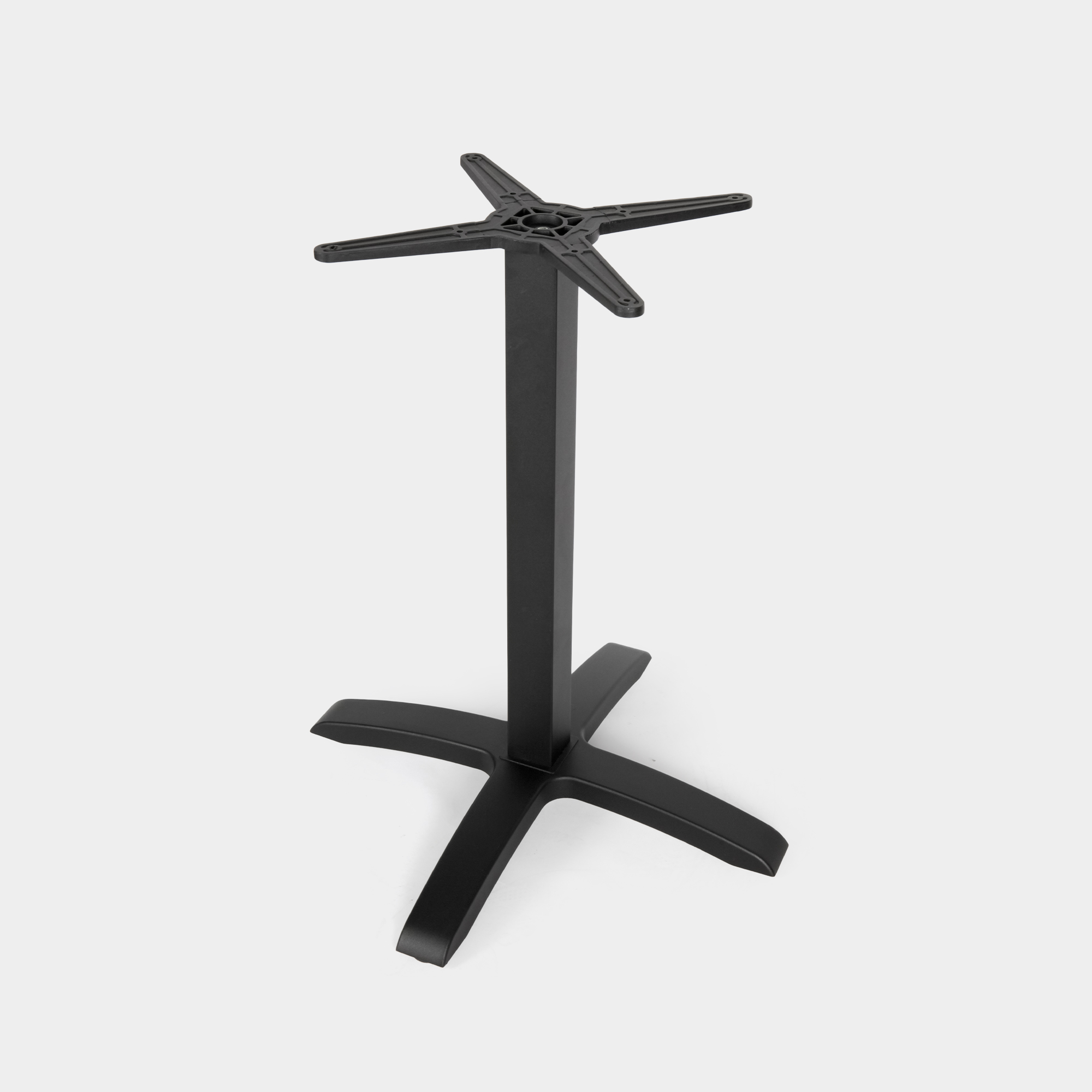 Dieses Tischgestell wurde speziell für den Einsatz in gastronomischen Einrichtungen sowie im Innen- und Außenbereich konzipiert. Die Konstruktion besteht aus einem Kreuz- und Säulenelement aus hochdruckgegossenem Aluminium sowie einem Sockel aus Gusseisen. Die Oberfläche ist mit einer elektrostatischen Pulverbeschichtung versehen und in der Farbe Schwarz erhältlich – für eine langlebige, korrosionsbeständige Nutzung.